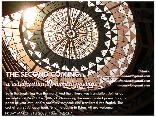 “The Second Coming” (all puns and cleverness intended) is going to be a mix of two formats. Original poetry, and poetry in translation. The idea is to not only encourage people to get a feel of performing their own writing, but to also hone poetry appreciation and performance poetry in itself, by sharing some of the best verses through the ages. Because March 21 is World Poetry Day we celebrate translation in particular, the gift it gives to the world at large. Basically, in addition to any poetry of your own, bring along a poem that was not originally in English. Think Octavio Paz, Rabindranath Tagore, Anna Akhmatova (for examples) and you’ll see what we’re trying to do.